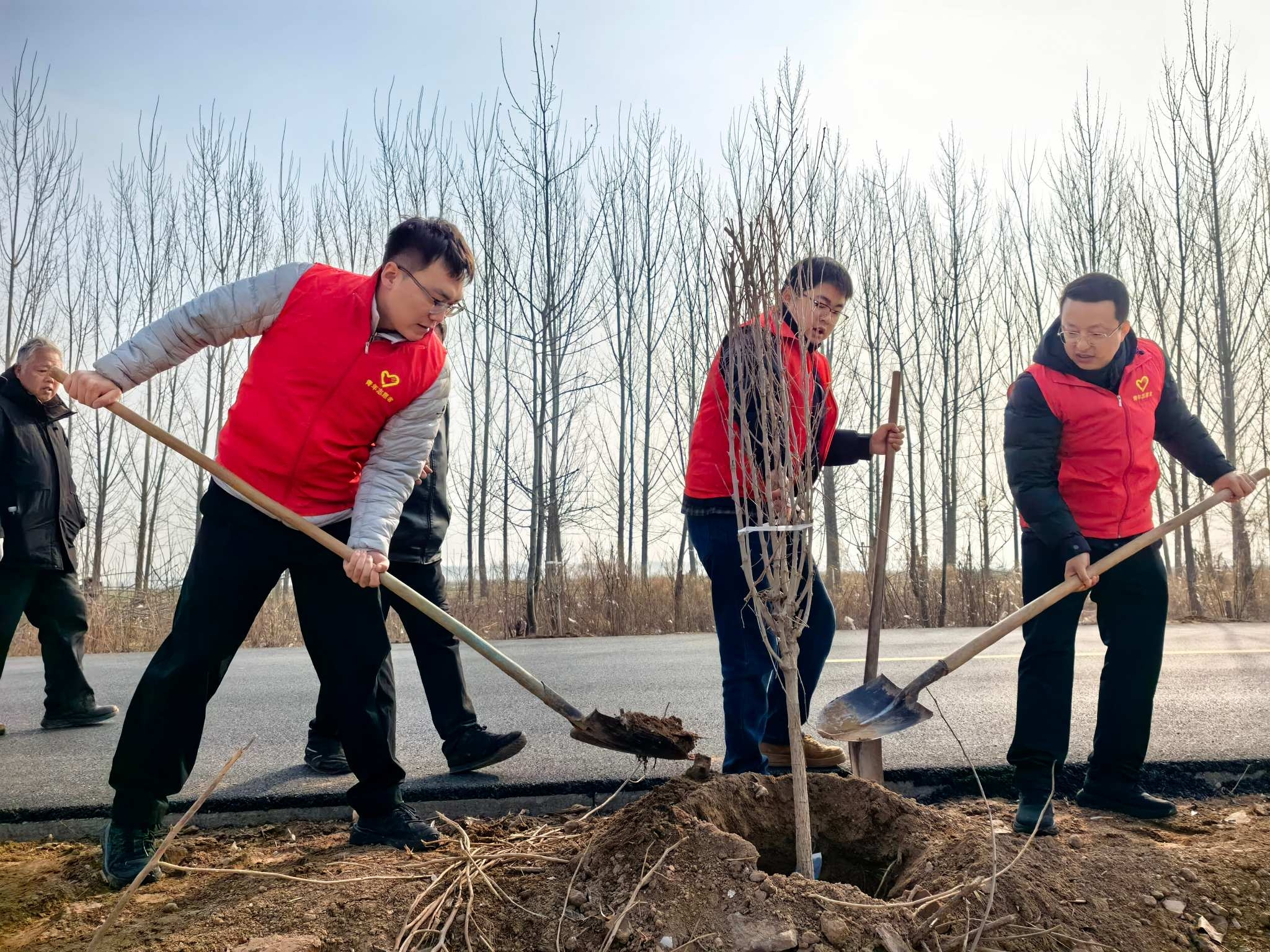 中铁六局北京公司石雄铁路项目部团员青年开展“青春添新绿,建功在石雄”义务植树活动,为石雄动车所周边添绿,用青春力量助力京津冀协同发展。(肖旭)
